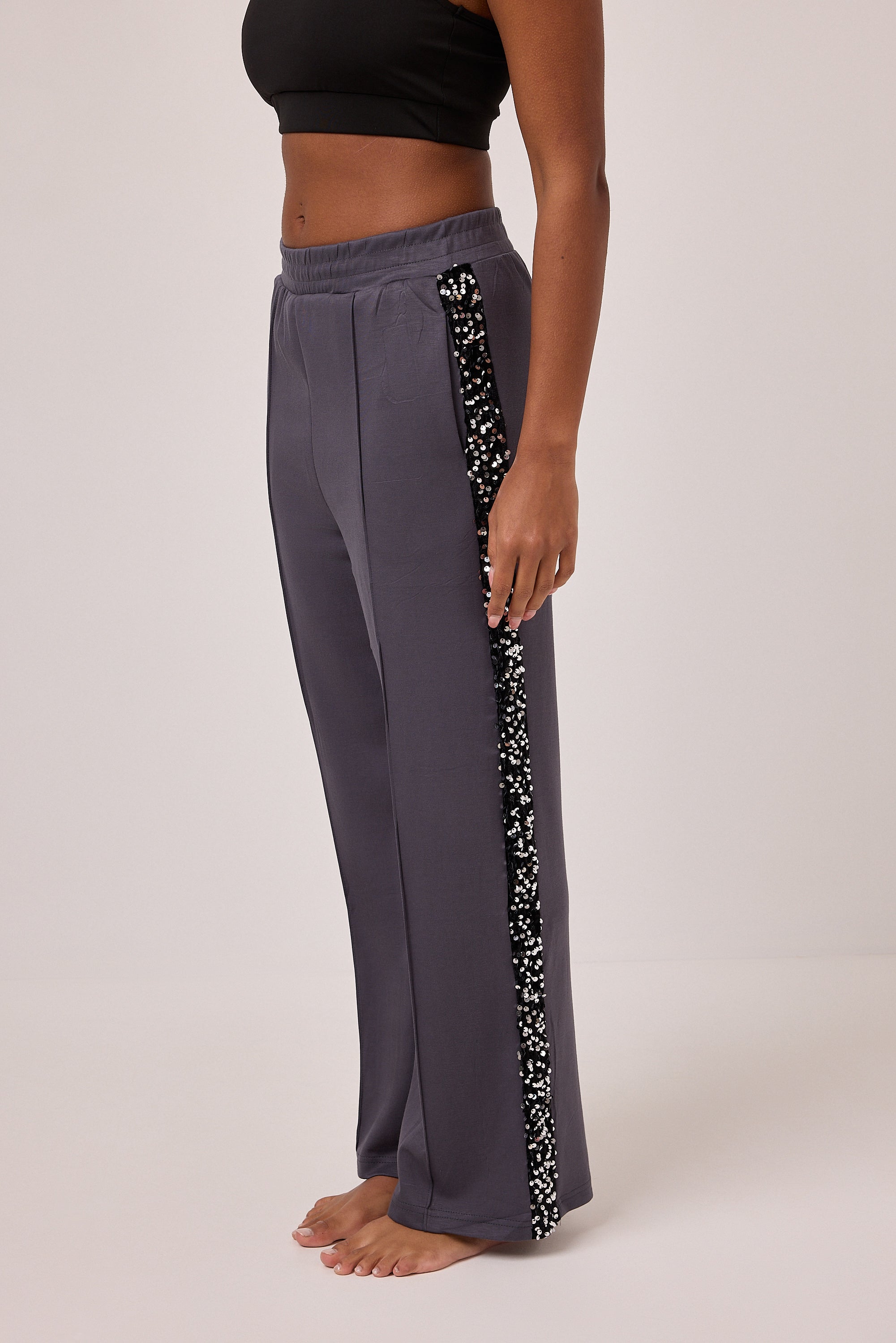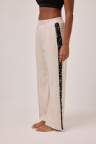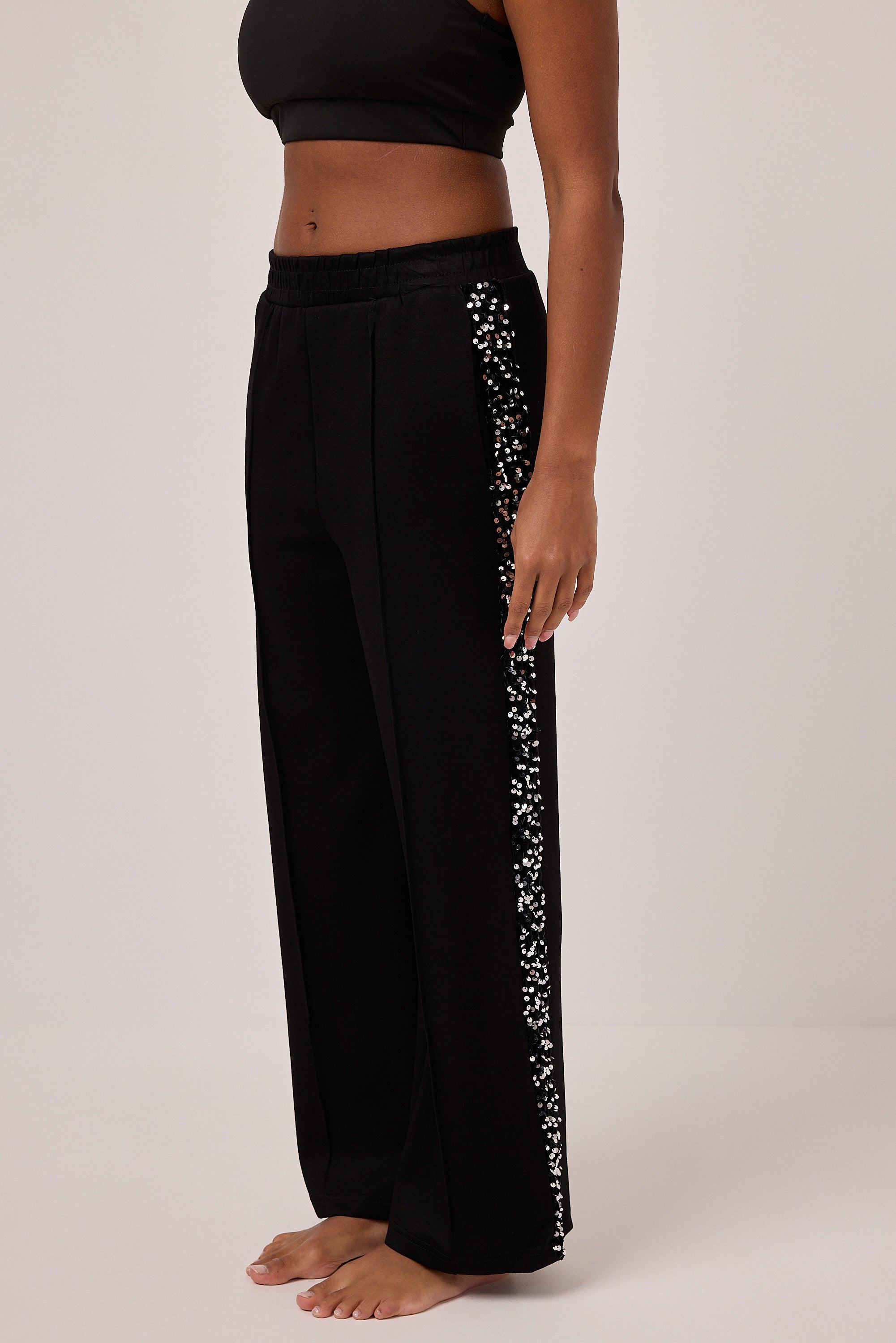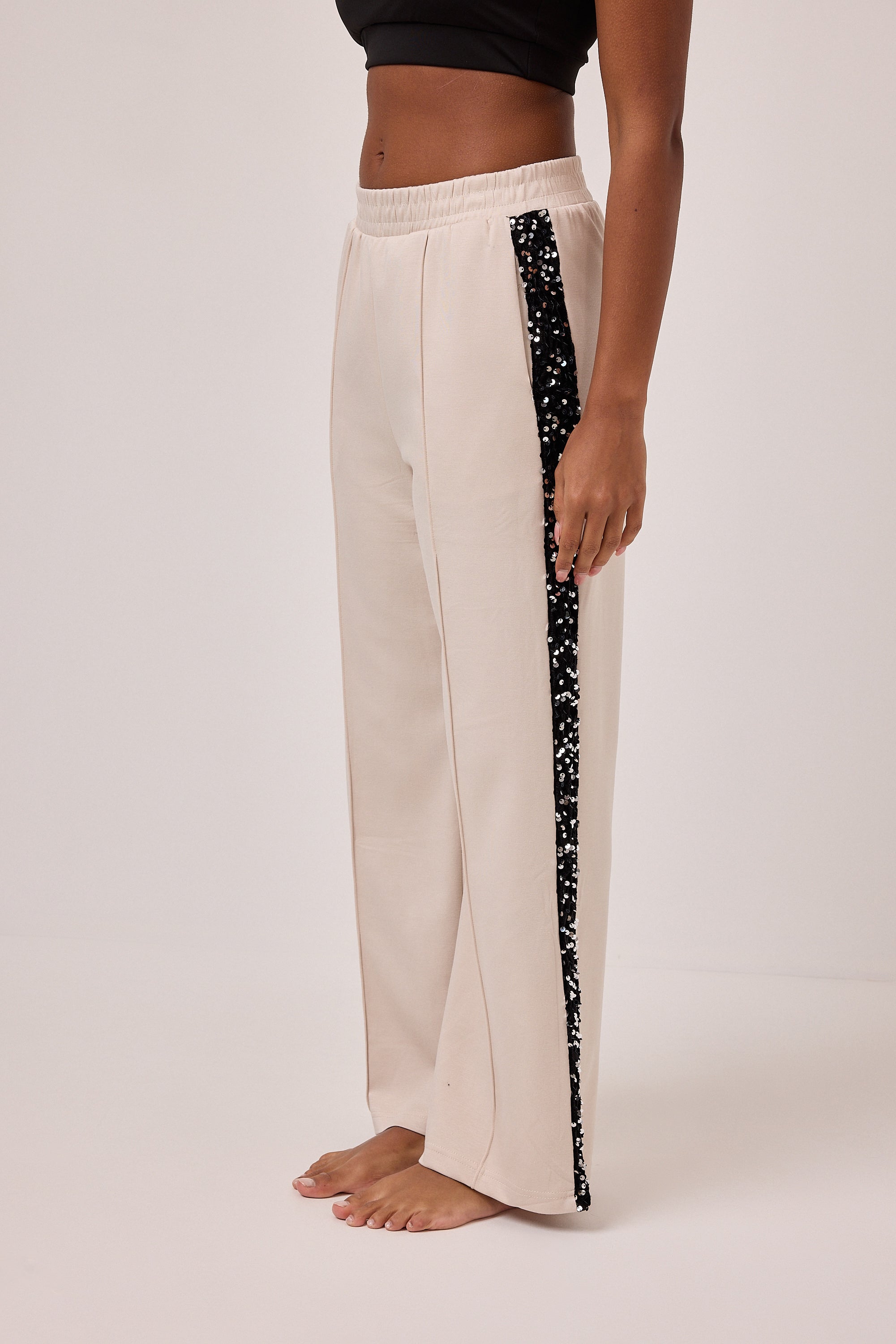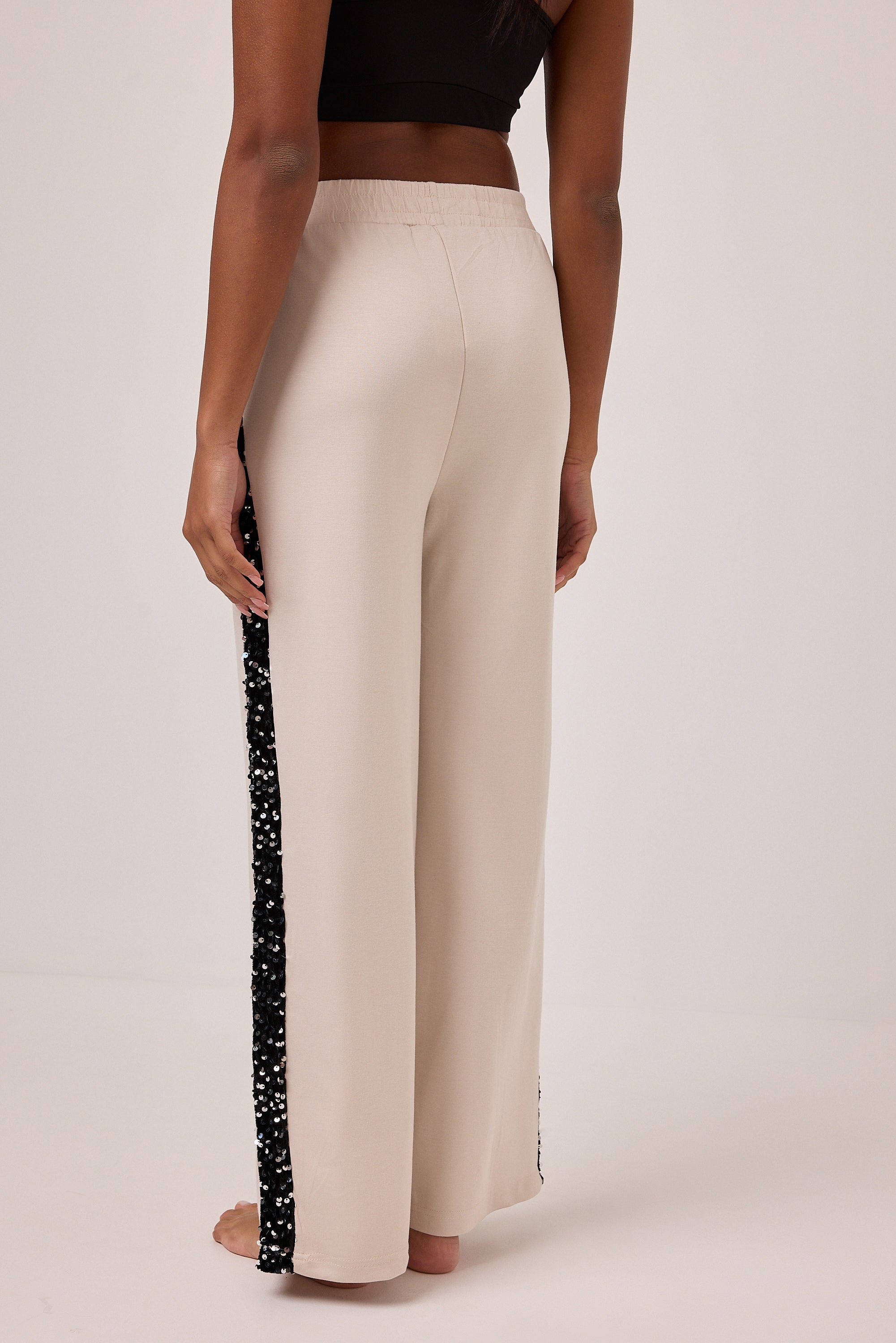 Wide trousers with decorated side band, perfect for a casual or sporty-chic look.